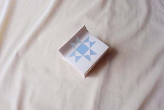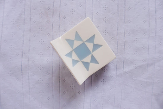 Quilt love in a claw clip. The Faded Denim Quilt Claw features a traditional quilt block pattern laid into a super strong hair clip. This small claw is best suited for all hair types and comes in a bright white with baby blue inlay.