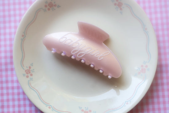 She’s so cute, so babygirl. The Babygirl Claw is a classic body shape with strong hold for all hair types, featuring miniature pearl wording on one side. Backed on shiny, ballet pink acetate with a milky lavender finish inside.