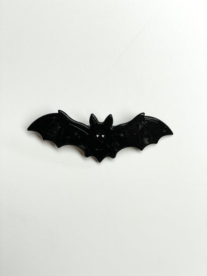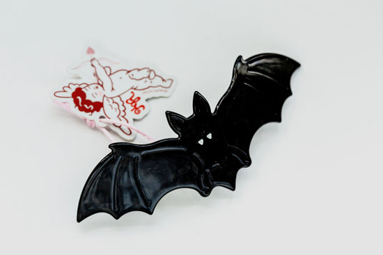 Sibella Dracula would be proud. The Bat City Barrette features a black bat with open wings, ready for take off for the best Halloween party around. Swirling black acetate is complimented by engraved details and white filled fangs on a non-slip French barrette backing. Part creature of the night, part tribute to our beloved, weird city.