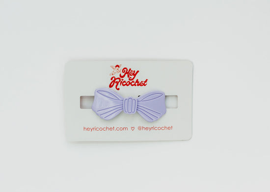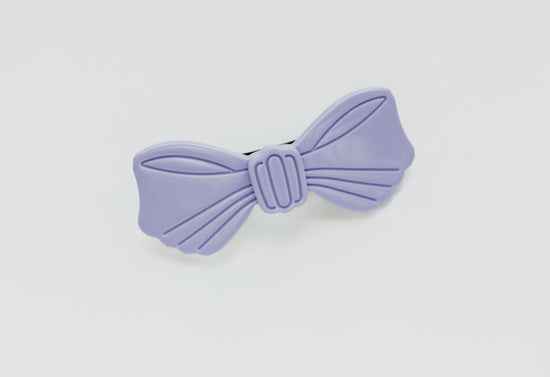 Inspired by classic childhood plastic bows, the Bow Barrette is an updated version of a vintage design. Backed by a French barrette, this lavender acetate clip features engraved detailing and an elevated middle piece. Add a pop of cuteness to your everyday look or a touch of nostalgia to a holiday formal look.