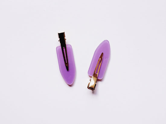 Our Setting Clips come in sets of 2 and are ideal for makeup application, skincare, and styling in all types of hair. The Two-Tone Setting Clips come in a pink and lavender acetate with gold hardware.