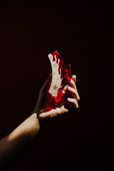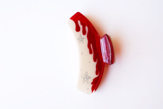 In honor of our favorite prom queen, the Carrie Claw is a bloody take on a star studded classic clip. Featuring a shimmery warm white background with hand spliced silver glitter stars, the Carrie Claw is accented by transparent bright red acetate to mimic blood drips.