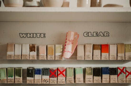 Designed by the team at Broad Studios Club House, executed by the team at Hey Ricochet. Created similarly to the sgraffito process in ceramics, the cherub and bow design on this vase shaped claw clip are carved through the top layer of acetate to reveal the imagery in the hot pink layer below. Cherubs and bows? Very demure, very cutesy.