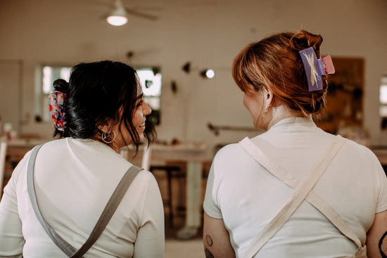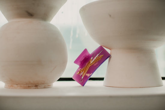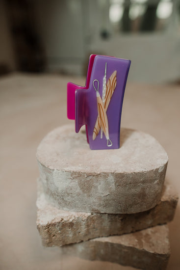 Designed by the team at Broad Studios Club House, executed by the team at Hey Ricochet. These two-toned claw clips will show off your pottery dedication wherever you go. Those who get it, get it - ya know? The Clay Tools Claw features traditional sculpting and pottery tools spliced into a double sided purple and pink background.