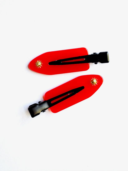 The weirdos are out, it's Halloween! The Dani Setting Clips are inspired by our favorite little sisiter, Dani Dennison. Ideal for makeup application, skincare, and styling in all types of hair. The Dani Setting Clips come in a semi-transparent bright red acetate with gold sun charm details.