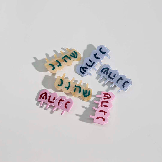 Eight times the fun. The Dreidel Clip is the perfect Hanukkah accessory, made for holding back your bangs, styling in an up-do, or pairing in a set. These hand spliced clips come in three color variants–pink with maroon, baby blue with navy, and wood grain with forest green. You’ll be the cutest one at the party whether you roll nun, gimmel, hay, or shin.