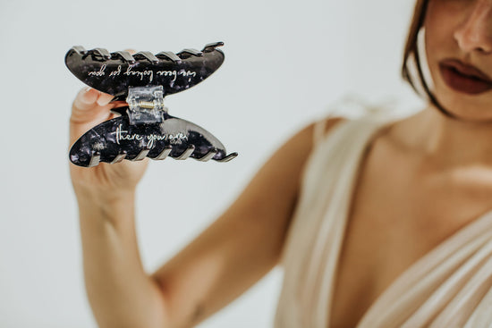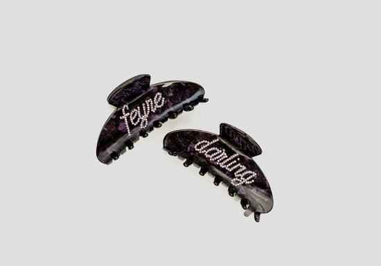 Hello, Feyre Darling. For fans of romantasy dream couple Feyre and Rhysand, this classic claw clip features gem detailing on each side that reads “feyre” and “darling”. Backed on swirled dark purple acetate with light lavender gems and sure to make other readers swoon.