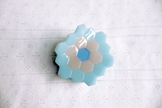 Inspired by the beloved hexagon quilt pattern, also called Grandmother's Garden or English Paper Piecing, the Hexie Claw is a mid-sized, multicolored claw with a traditional vibe. Available in two colorways: Ashley in red and pink, and Mary-Kate in blue and white.