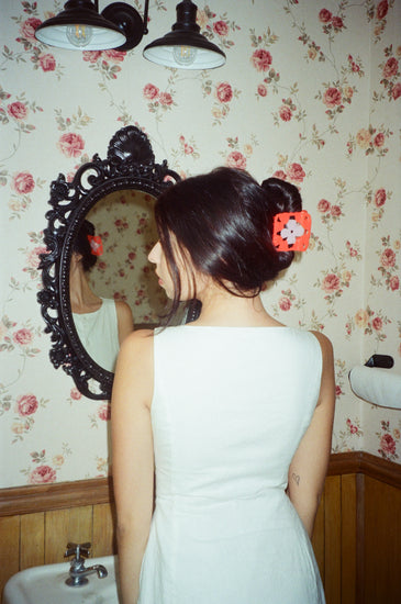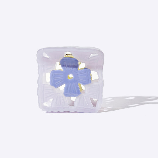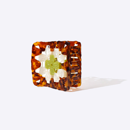 A claw clip for girls who have been 75 years old since birth. Designed to look like a crocheted granny square, the Granny Square Claw features multiple layers of colored acetate with cutouts and engraved detailing.