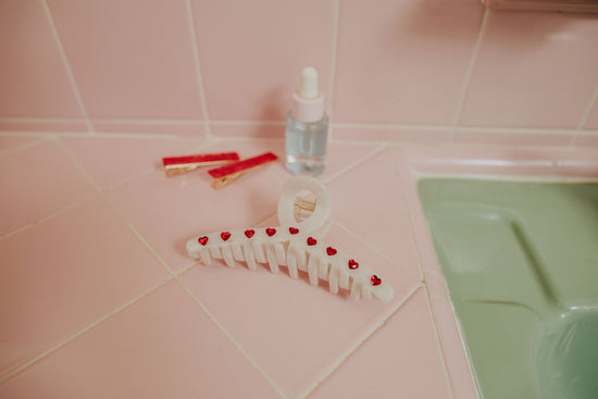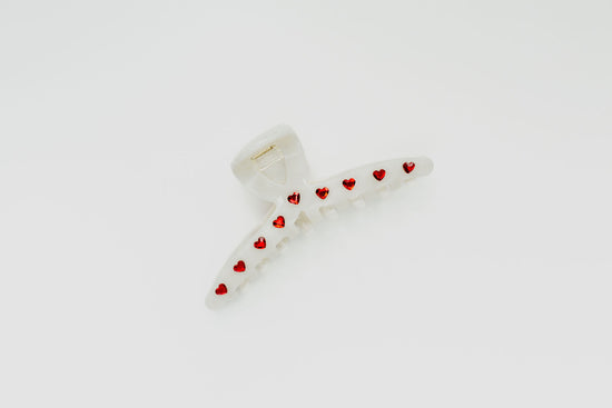 Do it with a twist! The Heart Gem Twisty Claw is a large sized hair claw made from a pure white acetate base with bright red heart gem details. Great for holding up longer or thicker hair, these twisty claws have a comfortable curve for all-day long wear.