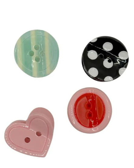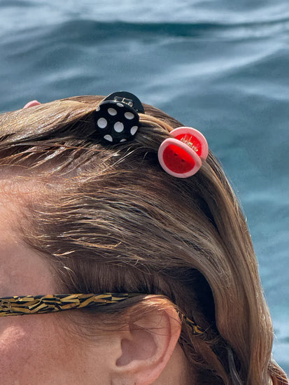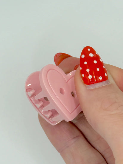 The HR x EB Button Mini Claw Set comes with 4 clips: round B&W polka dot, round mint stripe, round red and pink, and heart-shaped baby pink.