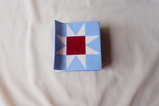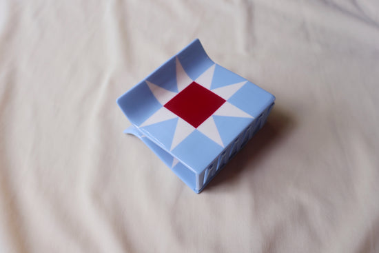 Quilt love in a claw clip. The Lana Quilt Claw features a traditional quilt block pattern laid into a super strong hair clip. This extra large claw is best suited for longer and thicker hair types and comes in a vintage Americana colorway with blue, white, and maroon.
