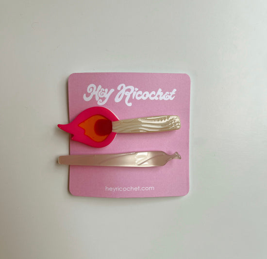 Puff, puff, pass the cutest clips you’ve ever seen. The Sesh Set is a set of two clips—a hand rolled cigarette and a matchstick. The first features a shiny, engraved cream body with a surprise peek of purple in the center. Backed on a super strong, bobby pin style slide, this low profile clip is the perfect subtle nod to garden girlies. The Matchstick Slide is a pop of color, featuring a hot pink and orange acetate flame set over an engraved matchstick.