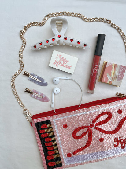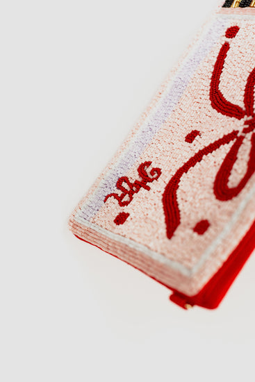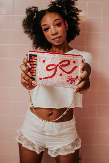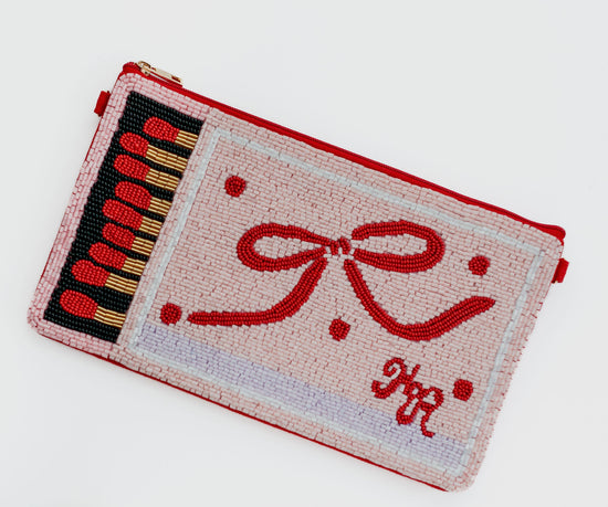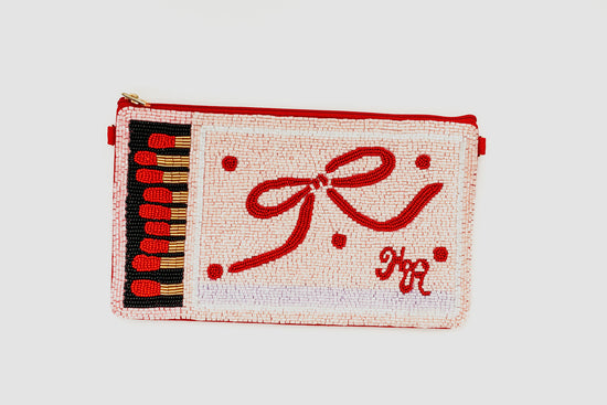 The Matchbox Beaded Bag is a classic it girl accessory. The front of the bag is fully beaded with original artwork featuring an open matchbox design with a red bow on a light pink background. Other features include a zipper closure, loops for attaching a chain or strap of your choice, and a bright red canvas back. Perfect for a night out on the town and concert venue safe size!