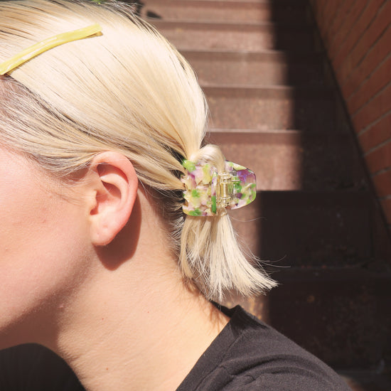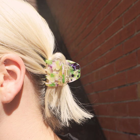 Little but fierce. Mini Claws are our fave for space buns, half up-half down styles on thicker hair, or holding it all up for our fine or short hair girlies. Sold individually or as a set of two, the Purple Haze Mini Claw is the perfect nod to 4/20 with a melange of clear, green, and transparent lavender acetate.