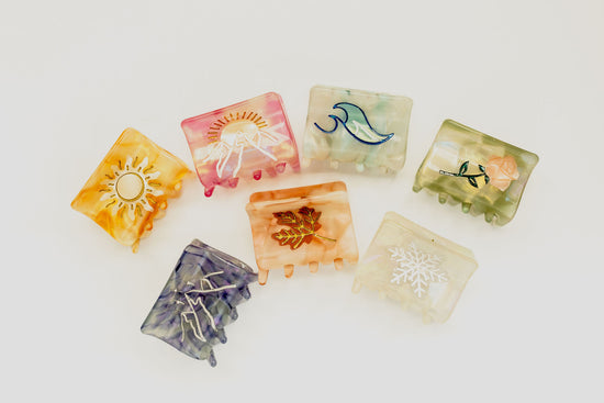 Bring the magic of your favorite fantasy land into your hair with the Mini Court Claws, featuring designs for the Dawn Court, Day Court, Night Court, Spring Court, Summer Court, Autumn Court, and Winter Court. For fans of any romantasy series, these mini claws are perfect for half up half down styles and all hair types.