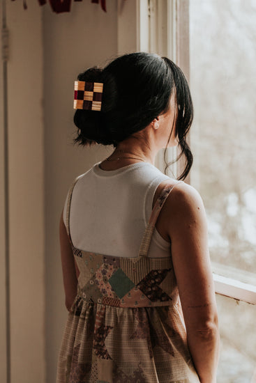 A classic nine patch quilt block in the form of a functional and durable claw clip. This medium claw is best suited for average to thick hair types and comes in solid burgundy and a warm tan stripe.