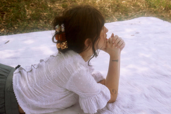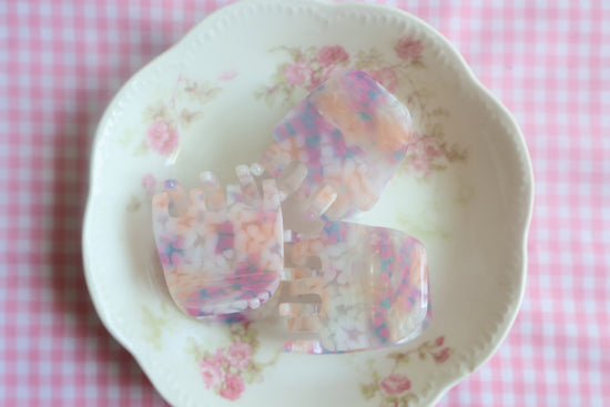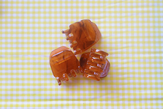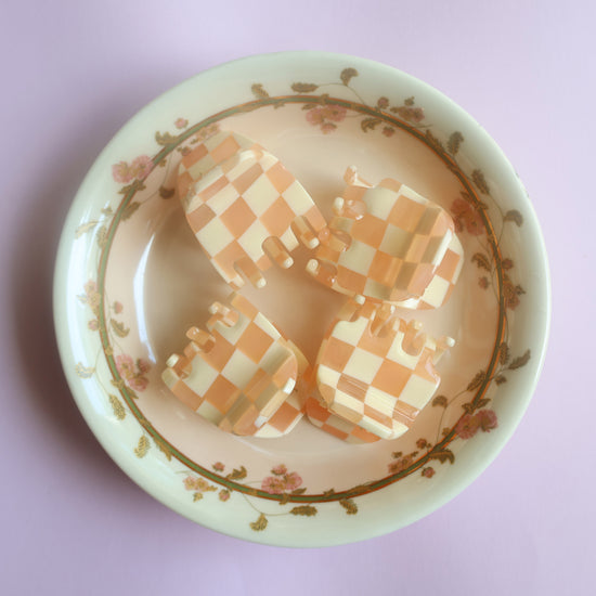 Little but fierce. Mini Claws are our fave for space buns, half up-half down styles on thicker hair, or holding it all up for our fine or short hair girlies. Spring Mini Claws are available in warm honey brown, peach and cream checker, and pink bluebonnet.
