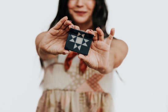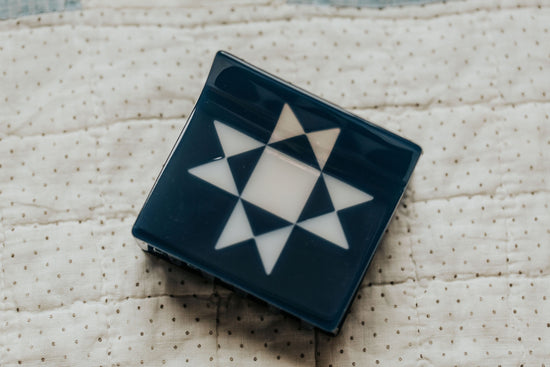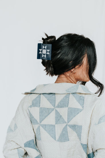 Quilt love in a claw clip. The Ohio Star Claw features a traditional quilt block pattern laid into a super strong hair clip. This extra large claw is the biggest size we currently offer, best suited for thick hair types and comes in demin blue with milky white.
