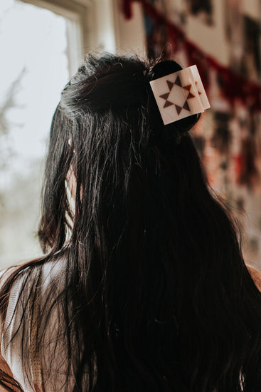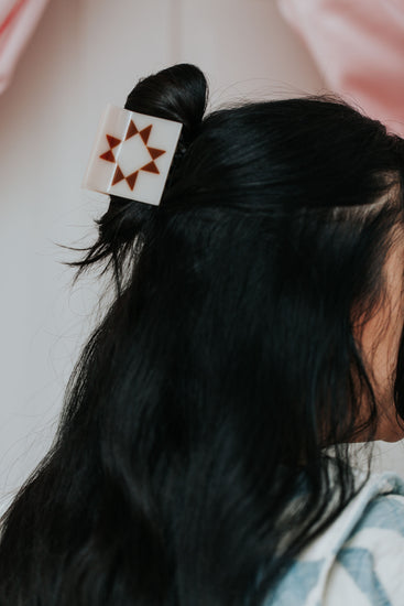 Quilt love in a claw clip. The Cinnamon Quilt Claw features a traditional quilt block pattern laid into a super strong hair clip. This small claw is best suited for all hair types and comes in milky white with warm brown star.