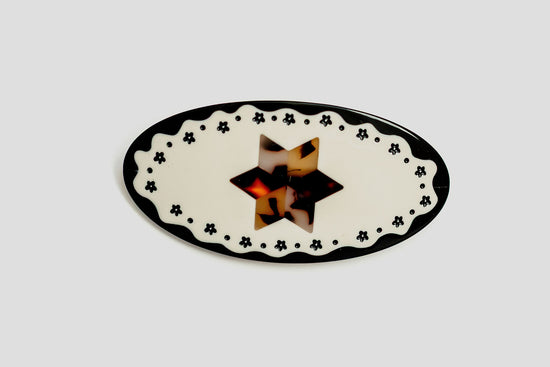 A classic, neutral accessory with a quilt star nod. The Tortoise Star Ponytail Barrette features a multicolored six pointed star on a solid white background with a hand drawn floral border. Perfect for half up, half down styles in thicker hair and to hold a full pony on thin to average hair.