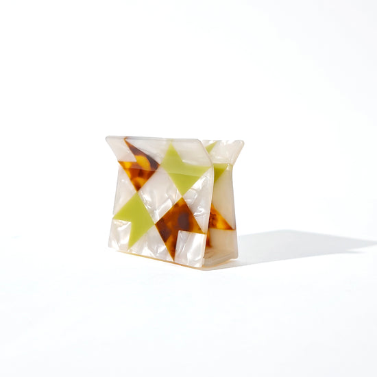 Quilt love in a claw clip. The Ribbon Quilt Claw features a traditional quilt block pattern laid into a super strong hair clip with tortoise shell and matcha acetate triangles laid into a swirled cream background. Available in two sizes: XS and L.