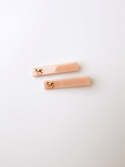 Christmas morning sweetness. The Rocking Horse Clips are a set of 2 long peach clips with gold rocking horse charms at the outer edge. Backed on alligator clips with super strong hold, the Rocking Horse Clips are perfect for holding back any hair type.