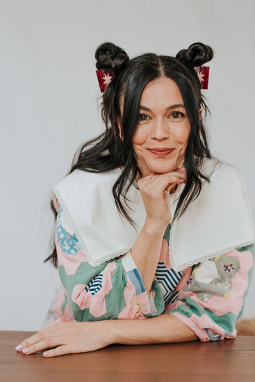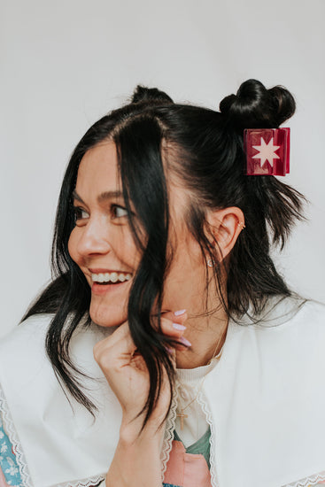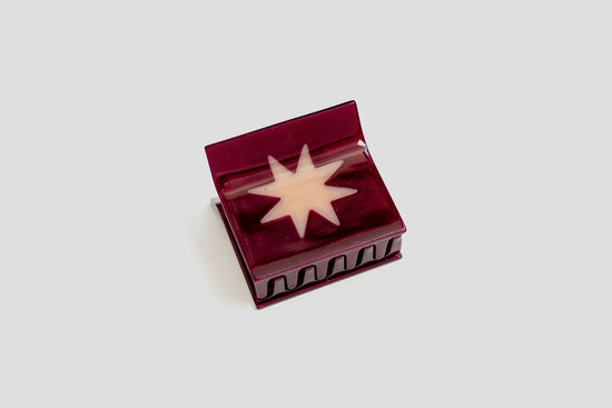 Quilt love in a claw clip. The Sawtooth Star Claw features a traditional quilt block pattern laid into a super strong hair clip. This extra small claw is best suited for all up styles on thin hair and small buns on average and thicker styles. Available in burgundy with a pink star.