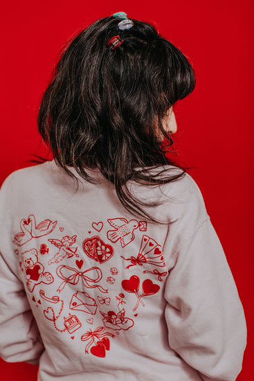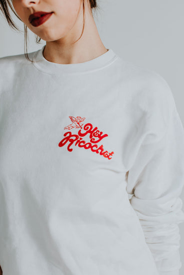 Locally printed in Austin, these Signature Crewneck sweatshirts feature the Hey Ricochet logo over the left breast and a heart of brand motifs across the back. Printed on pink and white Hanes Ecosmart material.