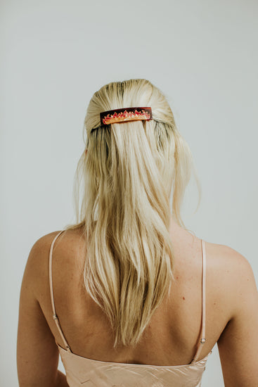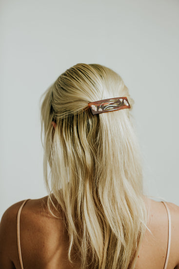 Designed in Austin, Texas and responsibly made in China, the Sister Drawer Barrettes are hand assembled from plant-based cellulose acetate. Due to the nature of the materials and process, each piece is unique and small variations will occur.