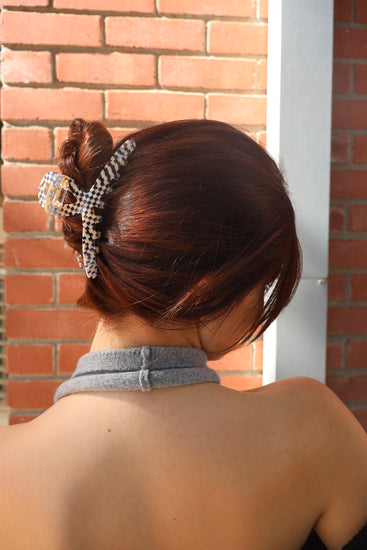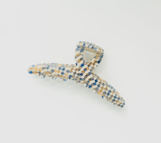 Do it with a twist! The Sky High Twisty Claw is a large sized hair claw made from a checkered light blue and off white acetate with translucent details and our signature Hey Ricochet shine. Great for holding up longer or thicker hair, these twisty claws have a comfortable curve for all-day long wear.