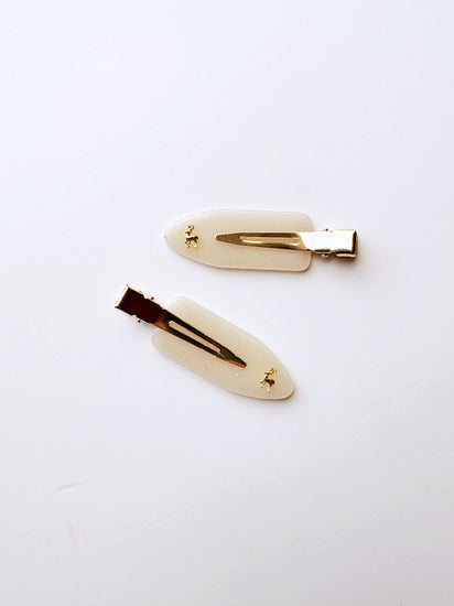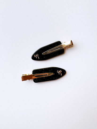 The Sparkle Sparkle Setting Clips are creaseless setting clips, ideal for makeup application, skincare, and styling in all types of hair. The Sparkle Sparkle Setting Clips come in sets of two clips with glitter inclusions. Choose from simple black or cream, or add a some extra whimsy with a gold bow or tiny reindeer!