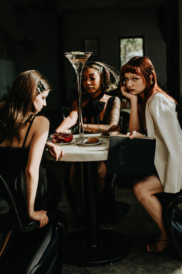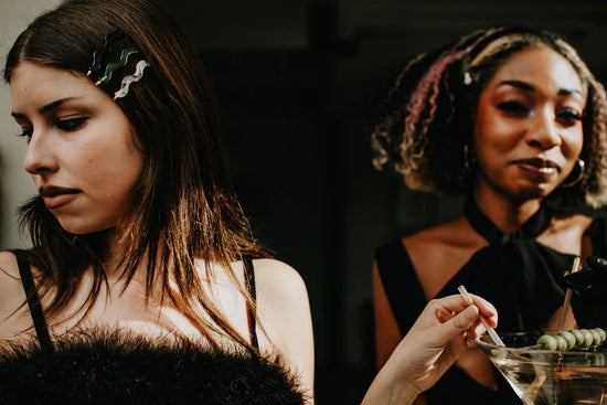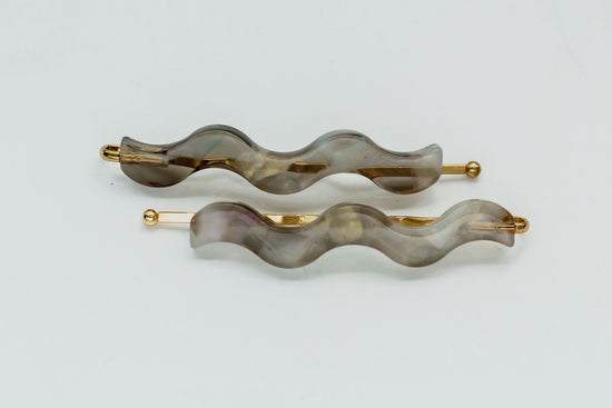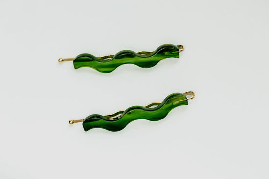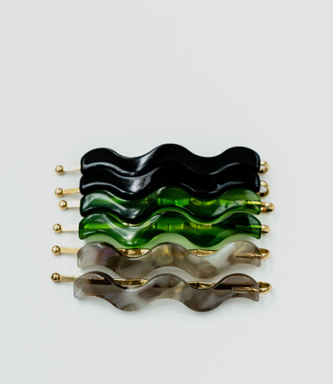 Simple wiggly clips in obsidian, smoky quartz, and emerald backed on bobby pin style slides. Squiggle Pin Clips come in sets of 2 and work best in thick or textured hair to get a good hold.