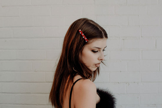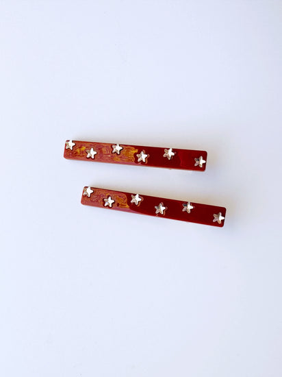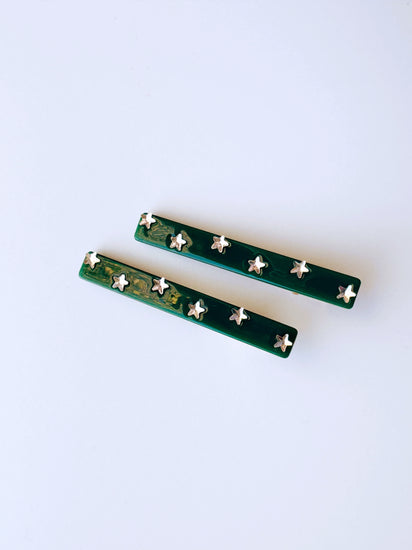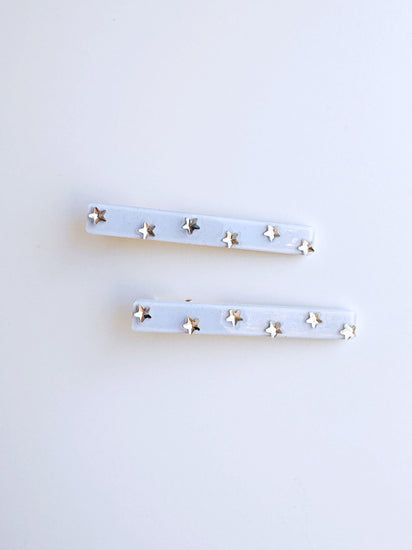 A little sparkle, sparkle. The Stardust Clips are a set of long, thin hair clips with raised silver star details. Backed on alligator clips with super strong hold, the Stardust Clips are perfect for holding back any hair type. Available in four holiday colors: black, cherry red, ice blue, and evergreen.