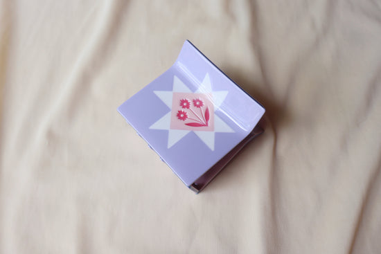 Quilt love in a claw clip. The Summer Floral Quilt Claw features a traditional quilt block pattern with an engraved floral design laid into a super strong hair clip. This medium sized claw is made to suit all hair types and comes in lavender with a white inlay and pink engraving.