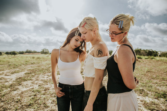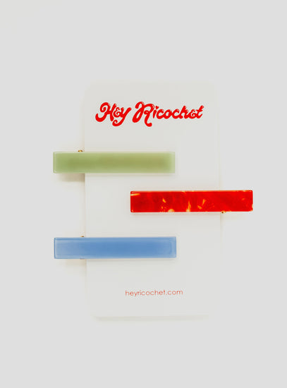 Basics, but never basic. The West Texas Alligator Clips are a set of 3 thick line shaped clips in bright red, periwinkle, and jade green. Clips are backed on super strong, alligator clips for all day hold. Wear them all at once or one at a time. Made for all hair types.