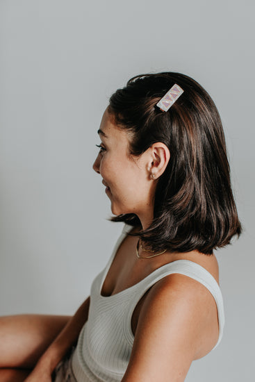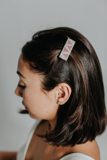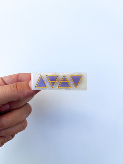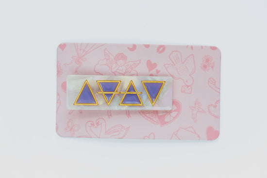 Call in the power of the air, earth, fire, and water with The Elements Clip. This small, rectangular alligator clip is perfect for holding back your bangs, styling in an up-do, or pairing in a set. Lavender alchemical symbols for the 4 elements are engraved with gold on an off white, swirling background.