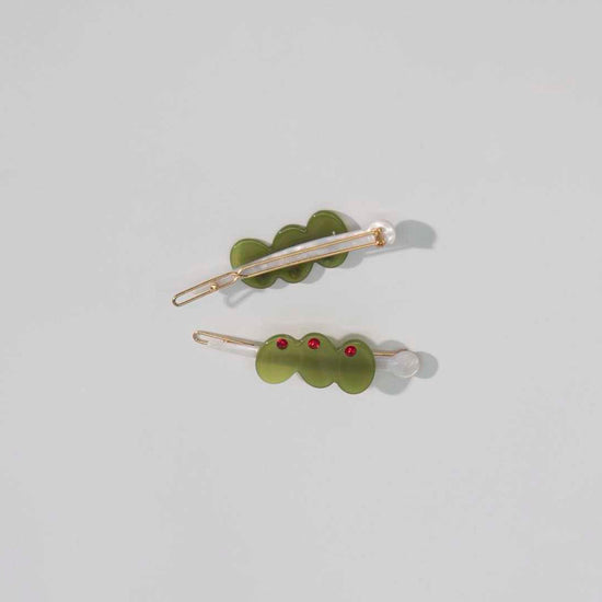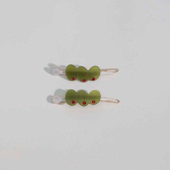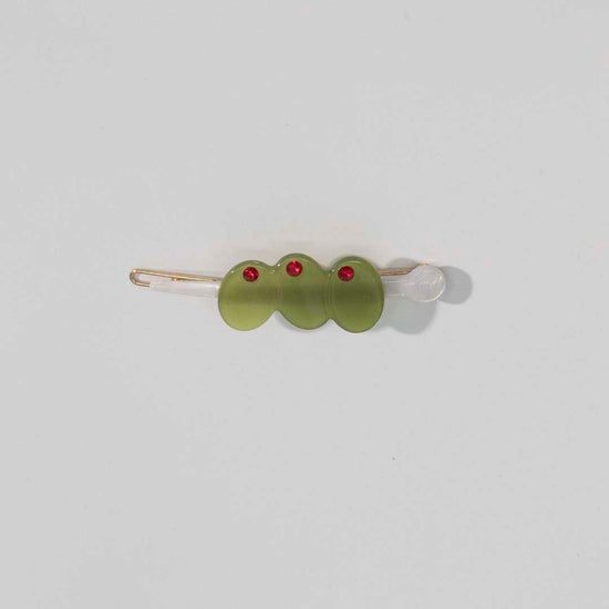 Stirred to perfection. The Extra Dirty Clip is the it girl accessory of the season, primed to keep you looking cute all throughout Olive Girl season. Featuring 3 raised green olives on a shiny silver pick with a red pimento gem.