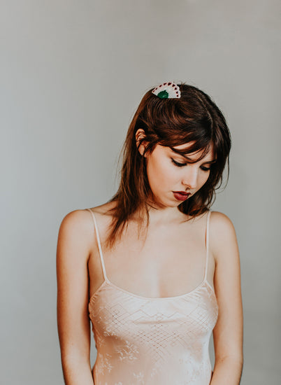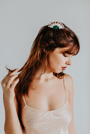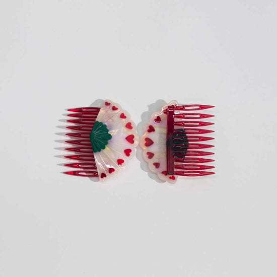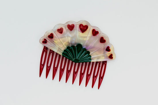 With creamy, mother of pearl acetate and transparent red heart details, The Lover Hair Comb is fit for an old Hollywood starlet. Made to fit snugly on your side or tucked into a tight bun, this decorative accessory will turn heads at every corner.
