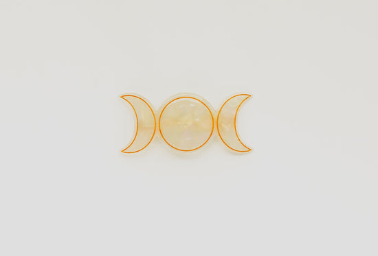Add the perfect celestial detail to any look with the Triple Goddess Barrette. Backed with a non-slip french barrette, crescent moons surround a full, center moon in a swirling acetate with detailing engraving to catch the light. Available in labradorite and opal.