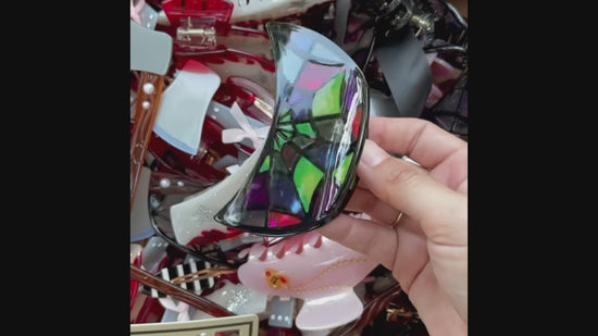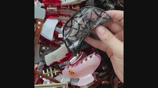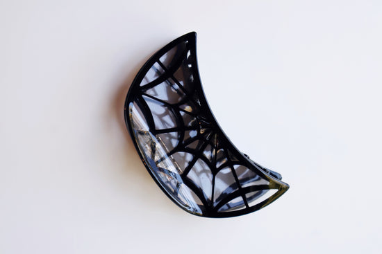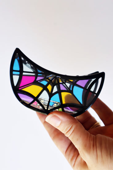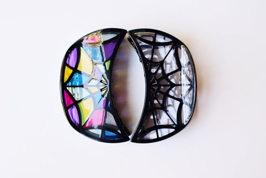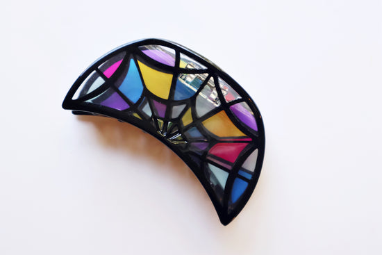 Two unlikely friends joining forces to create something beautiful. The Roommate Window Claw is a combination of our Wednesday and Enid Claws, mirroring their shared web window. With one clear transparent side and one rainbow side, your hair will be held securely through any adventure.