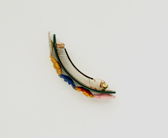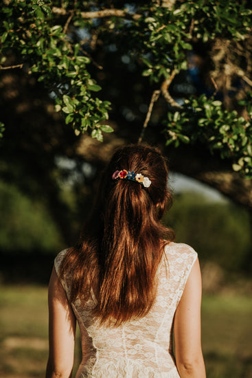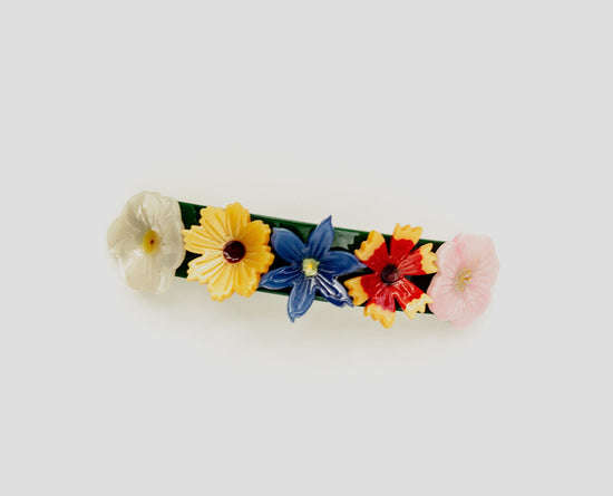 Designed in Austin, Texas and responsibly made in China, the Texas Wildflower Barrette is hand spliced together from plant-based cellulose acetate. Due to the nature of the materials and process, each piece is unique and small variations will occur.