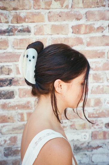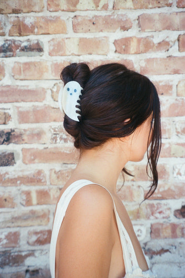 Hey, boo! Get a ghoulishly great hold with the Ghost Claw, available in 2 sizes for average and thick hair. Made fully from spliced acetate, these ghosties have a metallic sheen on their curved white bodies and solid black eyes and mouths.